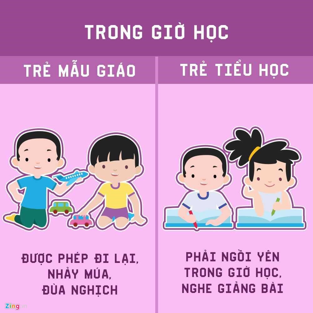 | Trẻ mẫu giáo được phép đi lại, nhảy múa, đùa nghịch trong lớp. Trong khi đó, ngay khi bước vào lớp một, các em phải tuân thủ quy tắc ngồi im nghe giảng, đi học đúng giờ giấc, bị kiểm tra bài vở và bị kỷ luật nghiêm khắc nếu không tuân thủ nội quy của nhà trường.
