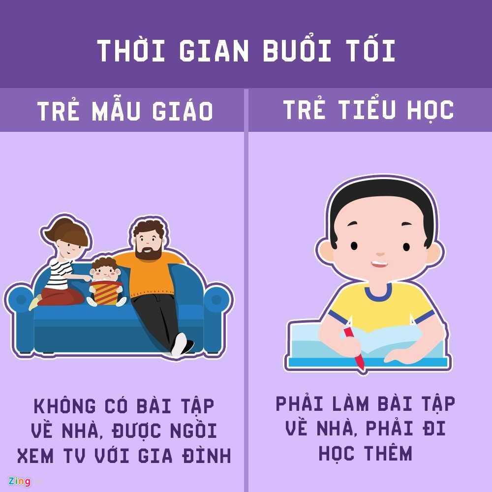 | Buổi tối là thời gian trẻ mầm non được thư giãn, nghỉ ngơi, chơi đùa với gia đình. Trong khi đó, áp lực học tập khiến trẻ tiểu học phải hoàn thành bài tập về nhà, chuẩn bị bài cho ngày hôm sau. Thậm chí, trẻ tiểu học còn phải tranh thủ thời gian buổi tối đi học thêm, phụ đạo nâng cao kiến thức.