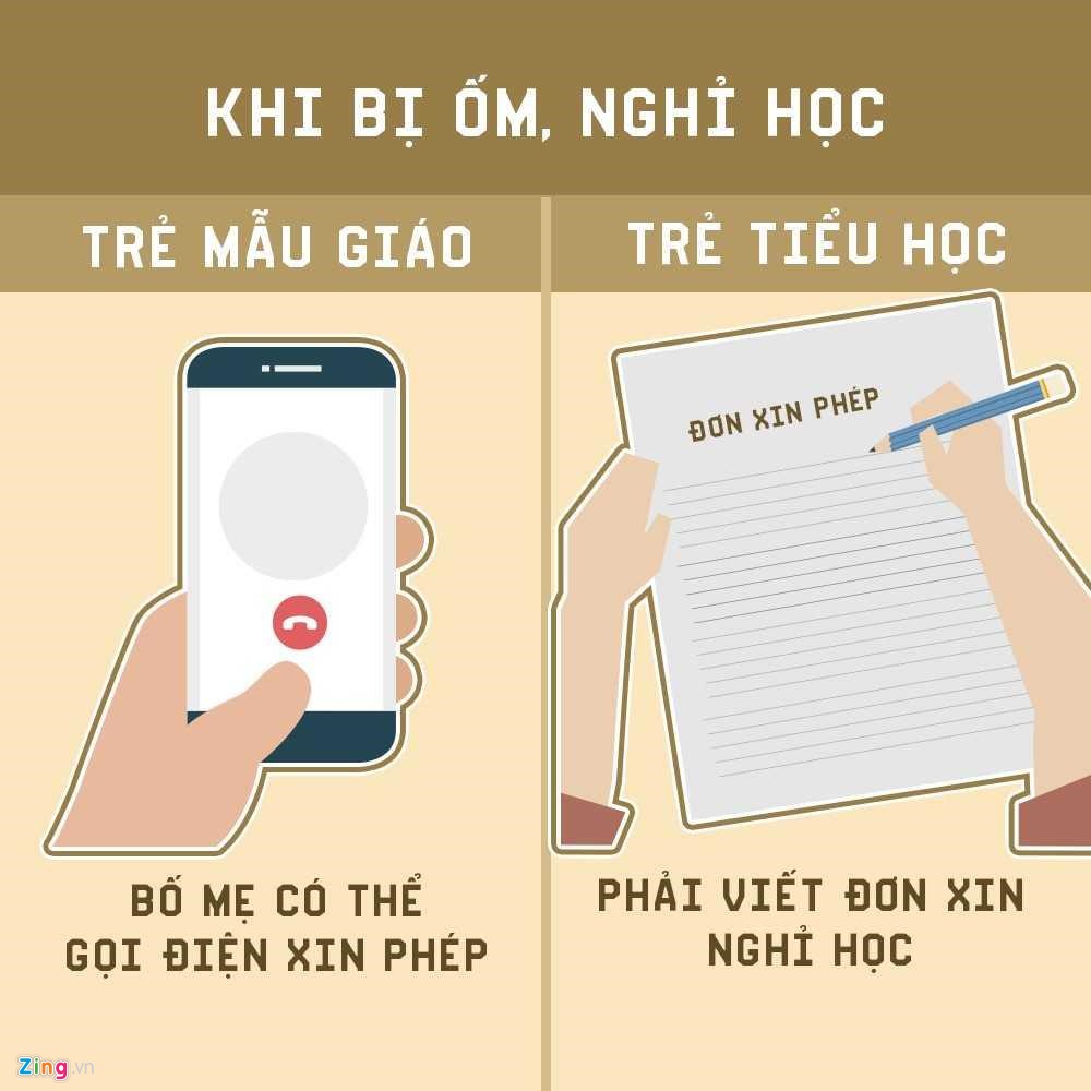 | Việc xin nghỉ học ở trường mầm non cũng đơn giản hơn. Phụ huynh có thể gọi điện, nhắn tin với cô giáo chủ nhiệm xin phép cho con nghỉ học. Nhưng ở tiểu học, việc viết giấy xin phép, thậm chí có cả chữ ký phụ huynh, là điều bắt buộc.