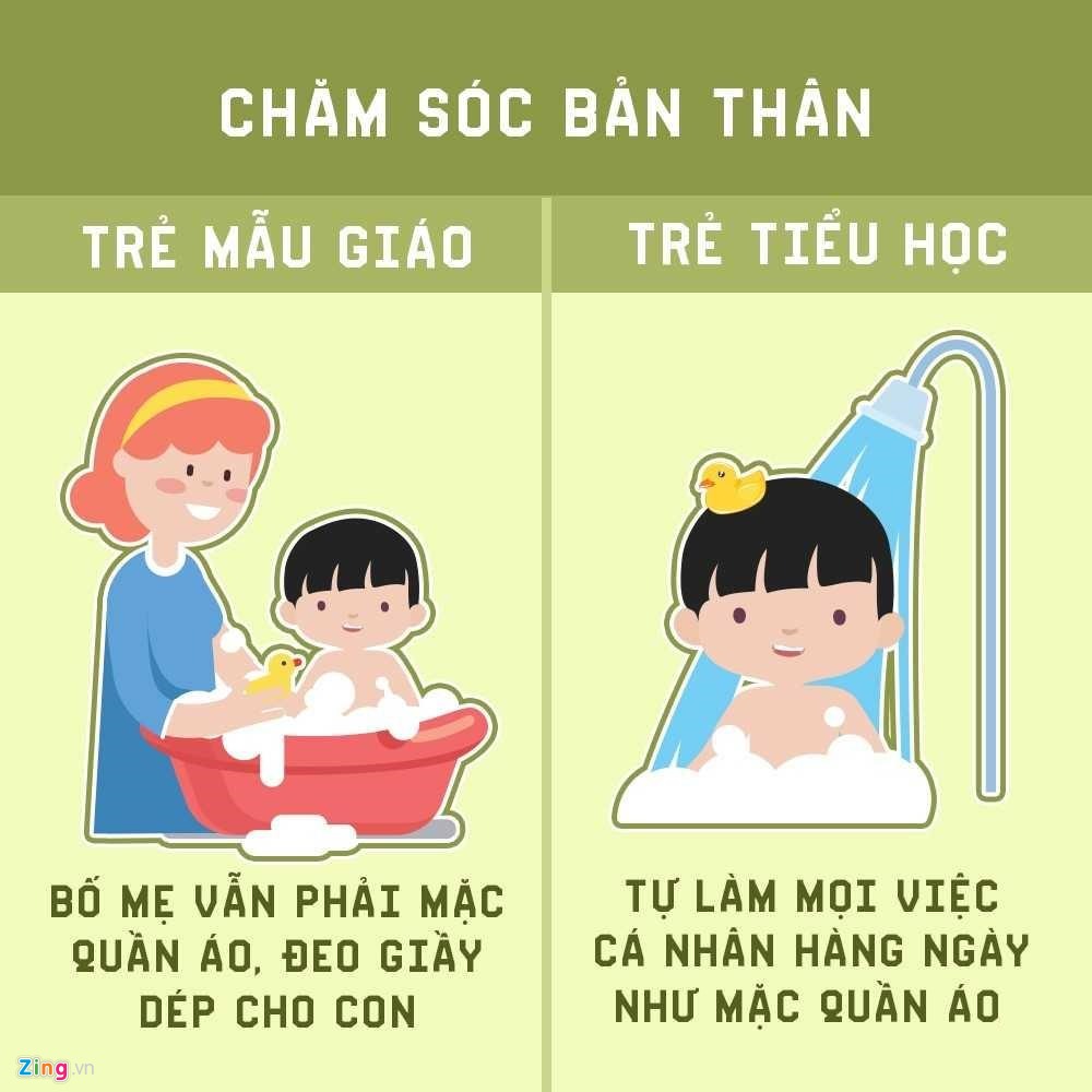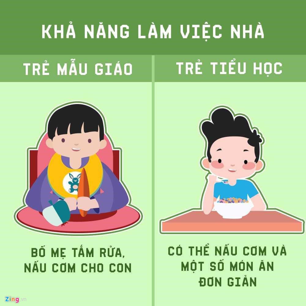 | Ở tuổi mẫu giáo, trẻ chưa thể tự mình làm những việc cá nhân như tắm rửa, ăn cơm. Nhưng khi lên tiểu học, các em được rèn luyện sự tự lập, biết giúp đỡ bố mẹ và làm những việc đơn giản như tự ăn cơm, thậm chí nấu một số món ăn đơn giản, quét dọn nhà cửa…