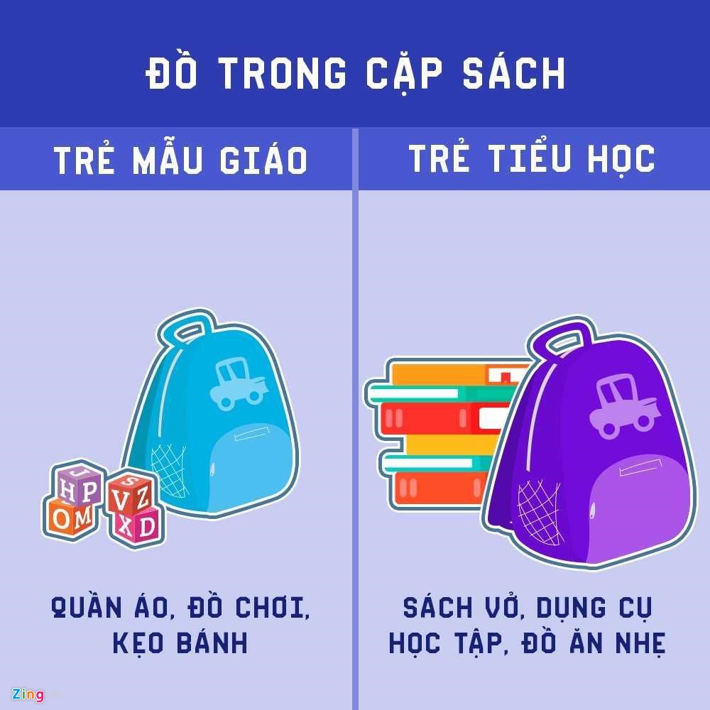 | Trong khi túi sách của các bé mẫu giáo sẽ có quần áo, đồ chơi, sữa, đồ ăn vặt, học sinh tiểu học sẽ phải gù lưng đeo hoặc kéo chiếc cặp rất nặng chứa đầy sách vở, đồ dùng đến trường.